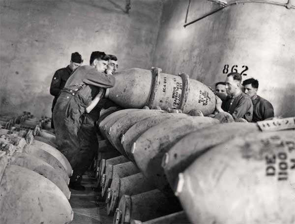 Eastlays Quarry: American-made 1000 lb HE bombs being manhandled onto the stacks at the underground depot in November 1944.